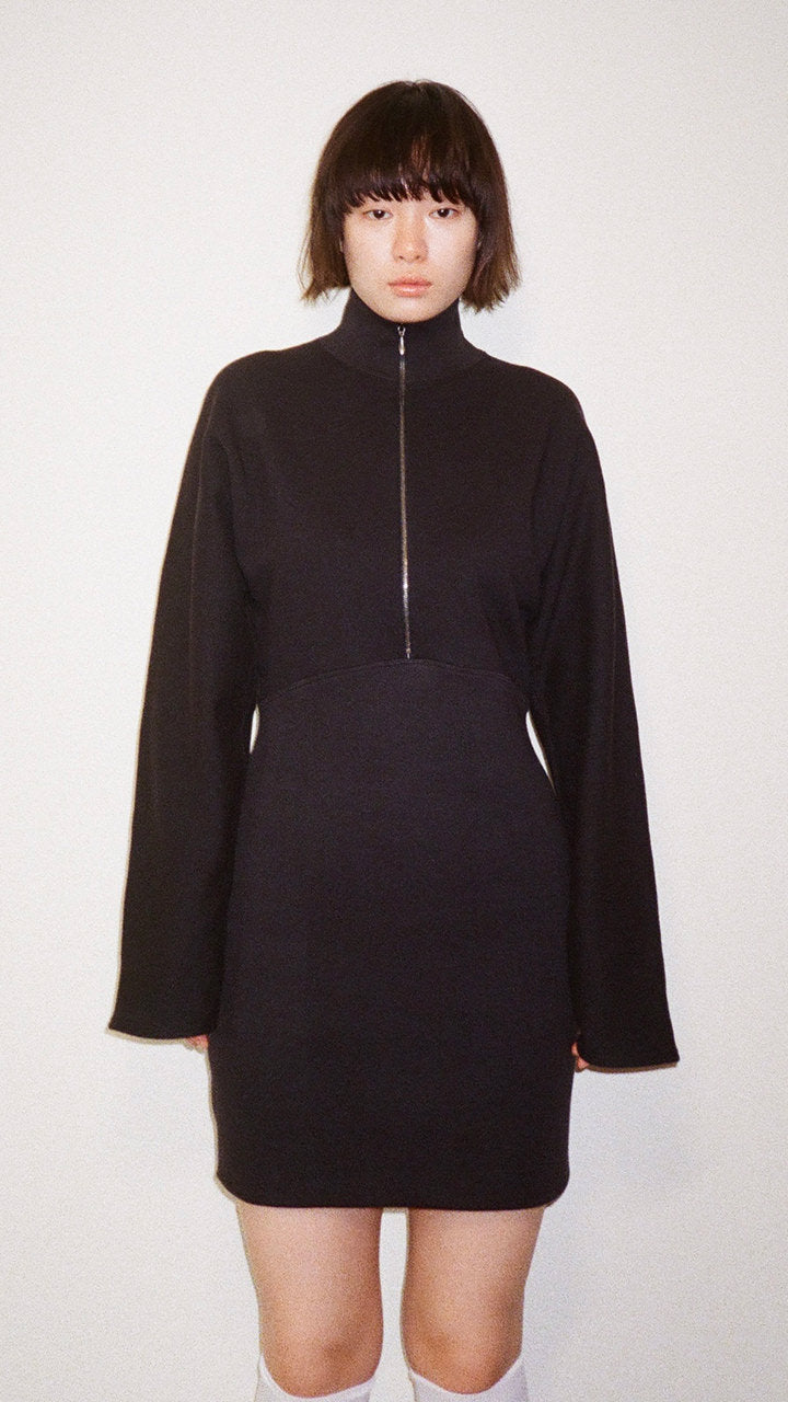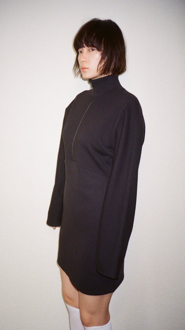 This is a turtleneck one-piece dress with deep armholes. The hip area has layered ribbed material so that the hip line is not emphasized. The material is cotton sweat fabric, making this a comfortable one-piece dress to wear.