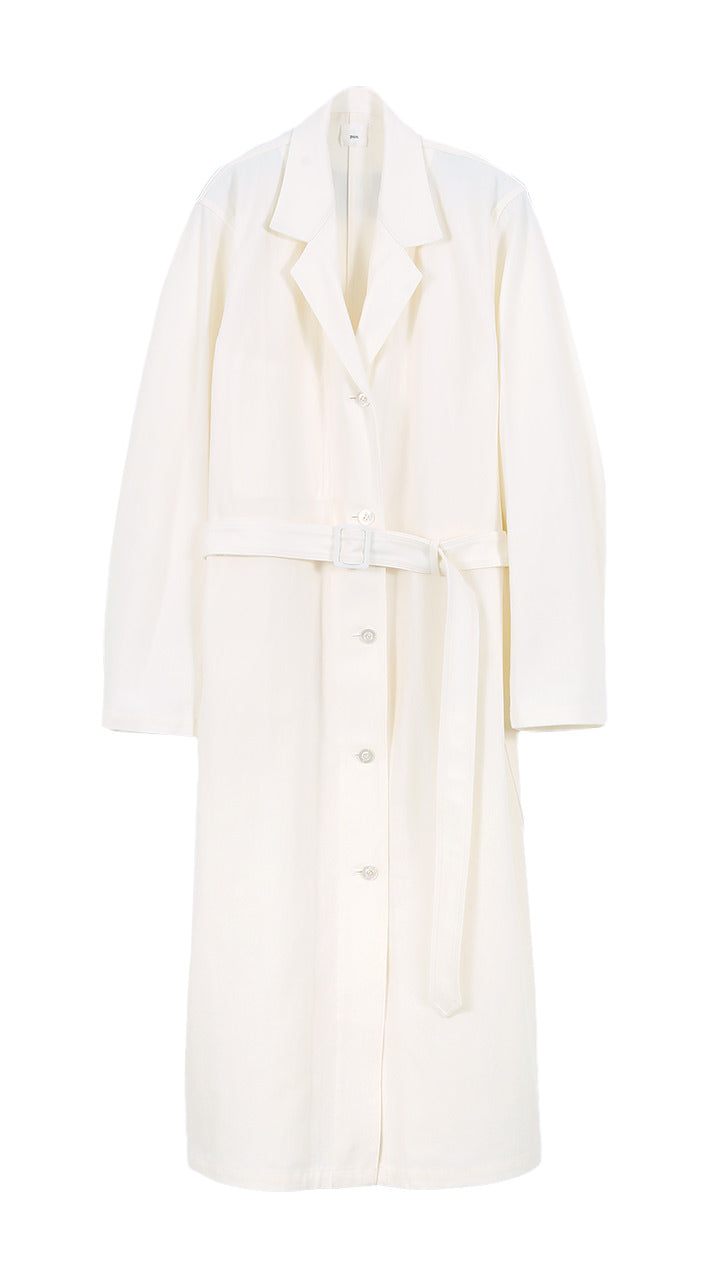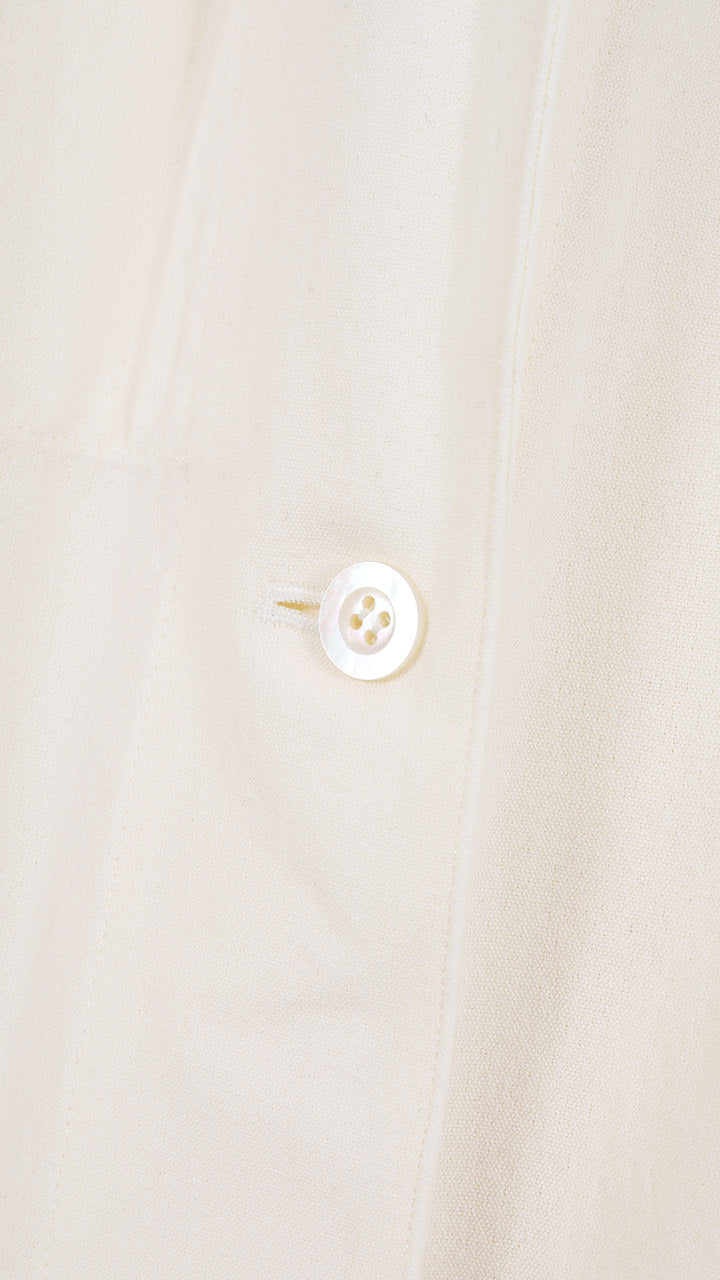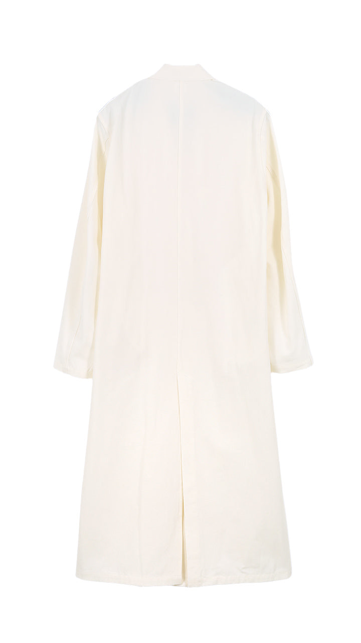 The WHITE version is made with strong-twisted cotton yarn in a plain weave fabric. It features a densely woven, deadstock-like fabric and a simple design, creating a coat that you can enjoy as it develops character over time.