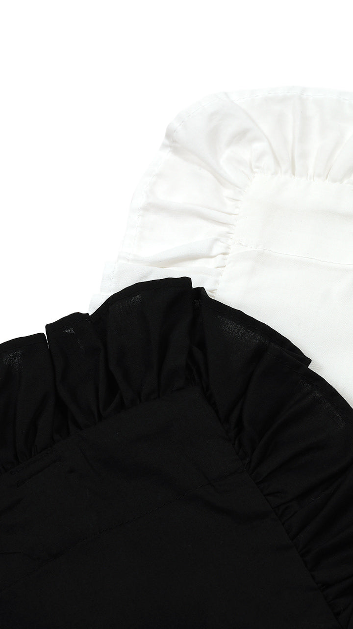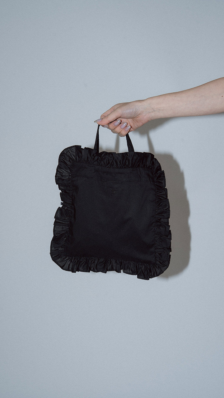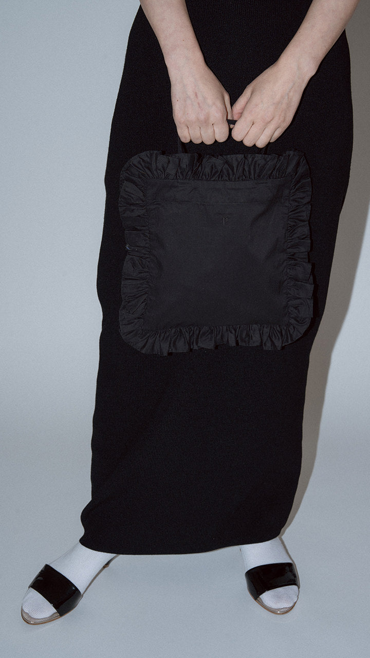 A classic pan tote bag with added frills. The frills are made from the same fabric and encircle the bag, and the letter 'P' logo is embroidered on the front.