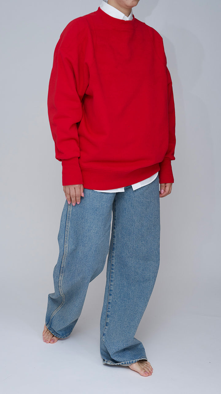 This sweatshirt pullover features a three-dimensional and striking silhouette created by its rounded arms and shoulder lines. Made from a special cotton material produced entirely in Japan from yarn creation to finishing, it has a vintage texture and a unique dry touch feel.