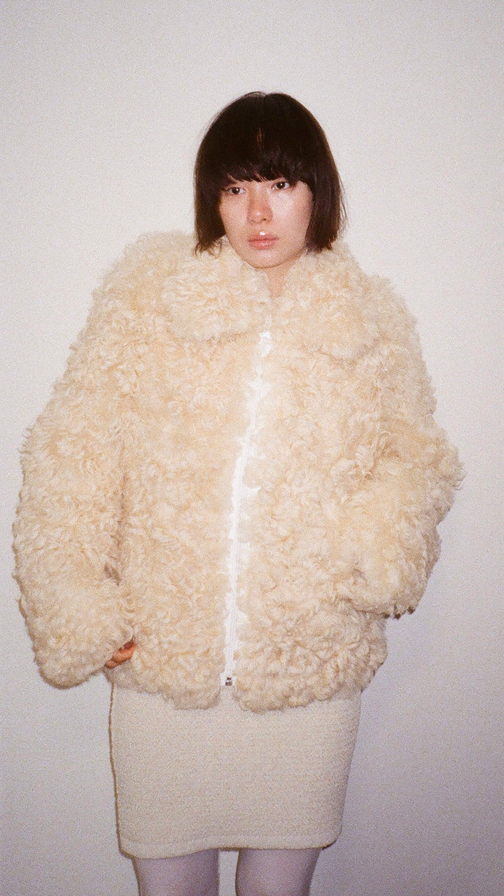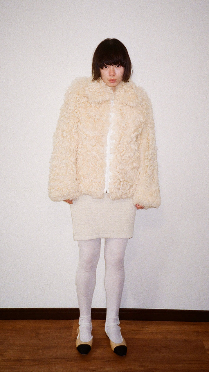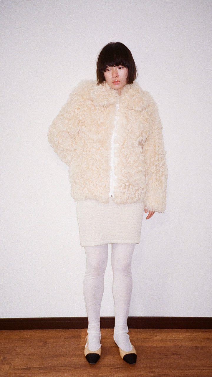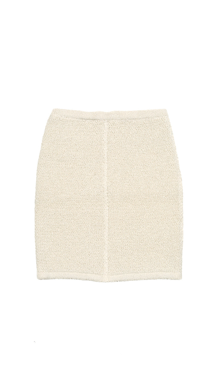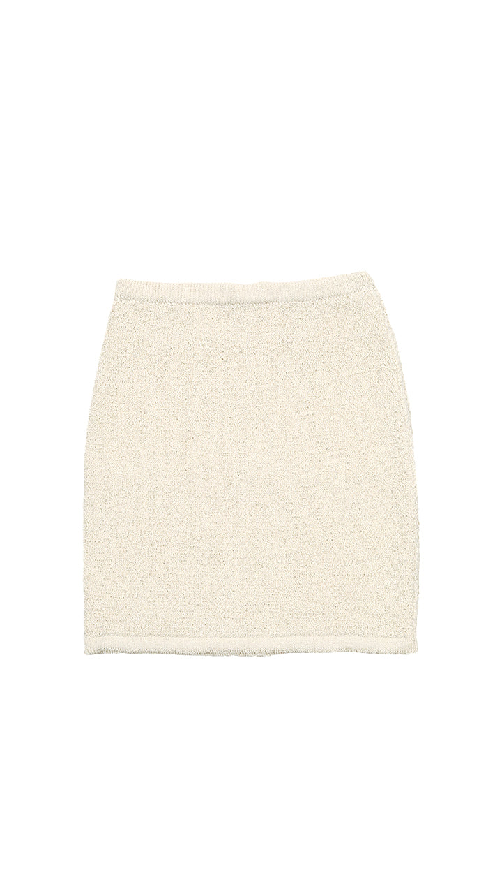 This item is made from naturally un-dyed silk threads that have been processed and carefully knitted. Because it is made of silk, it is a comfortable item to wear throughout the year, keeping you warm in winter and cool in summer. Additionally, by adding a pearlescent finish, a thicker fabric was achieved, resulting in a skirt made from a sport-like material.