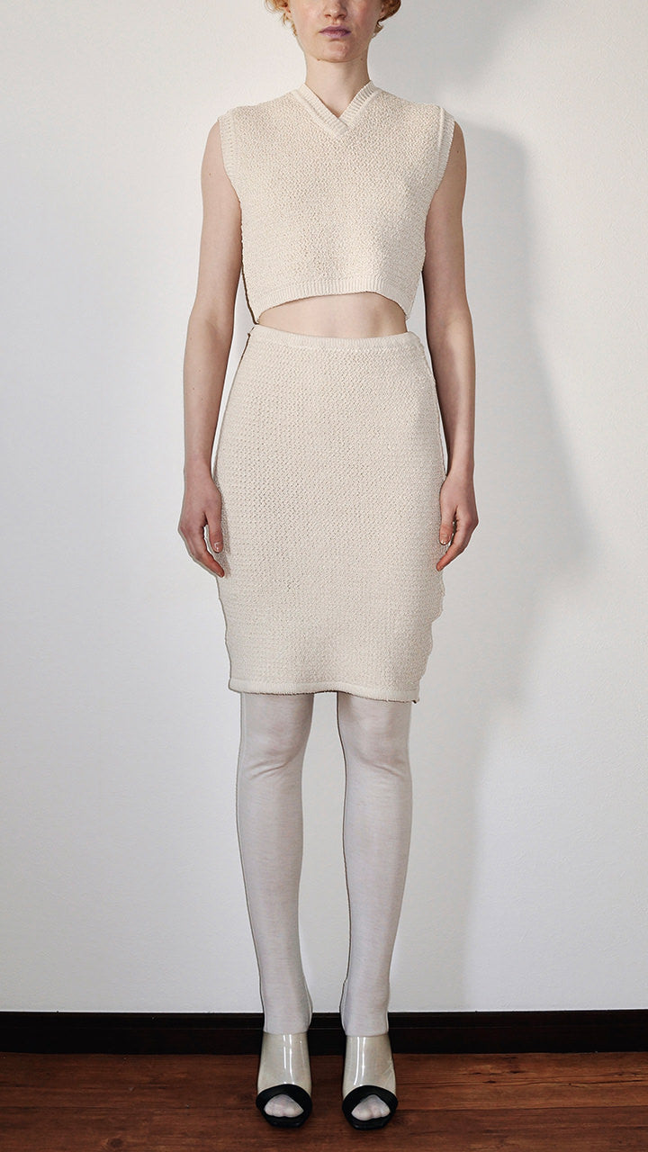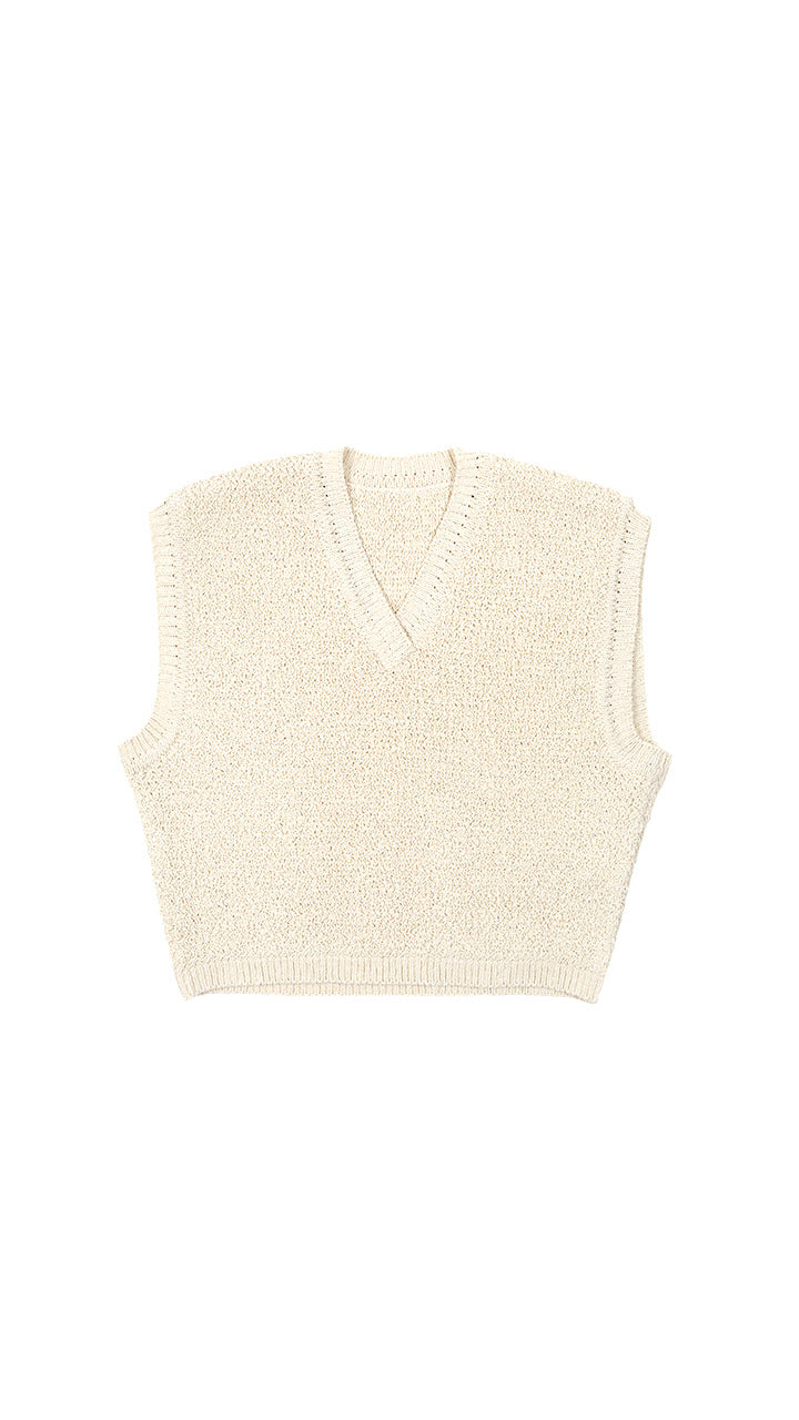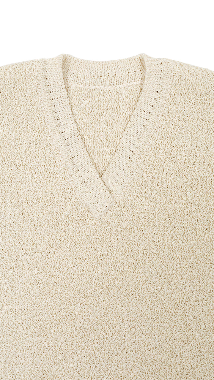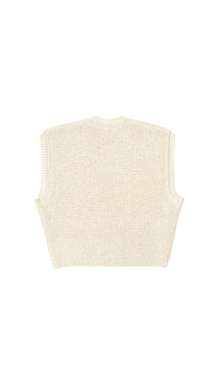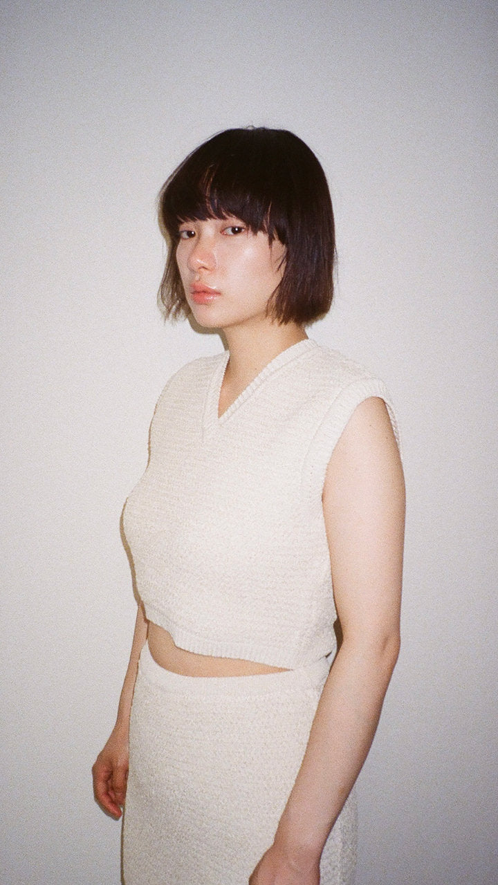 This knit is made from undyed silk with a pearl stitch, finished to resemble a bonded fabric. This vest can be worn on its own. It is slightly short and cute.
